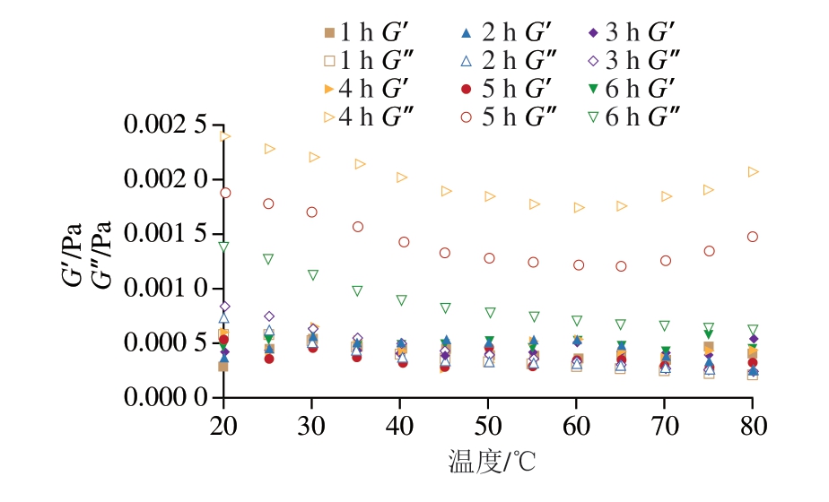 在20~80 ℃的范围内,以5 ℃/min的升温速率进行温度扫描,通过流变仪软件获得储能模量(G’)和损耗模量(G”)。