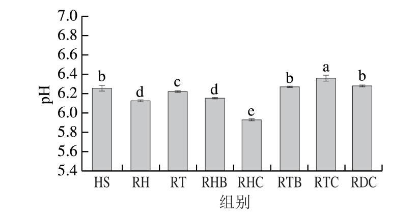 作为食品品质评价的关键理化指标,pH值的动态变化对预测肉制品贮藏稳定性具有重要影响[14]。由图3可知,不同热处理组pH值差异显著(P<0.05)。这一现象主要归因于热加工过程中脂肪、蛋白质及碳水化合物的降解反应,其产生的酸性物质积累导致体系pH值下降。与HS组相比,经2 次加热后,RDC组pH值未发生显著变化(P>0.05),而高温灭菌红烧肉(RH、RT)出现显著酸化。经3 次加热后,RHC组因脂质非酶促氧化加剧(不可逆氧化产物积累)导致pH值持续降低;RTB和RTC组pH值回升现象可能源于贮藏过程中碱性降解产物的生成及中和效应。该变化规律与蒸排骨预制菜热加工过程中pH值响应机制具有一致性[15]。
