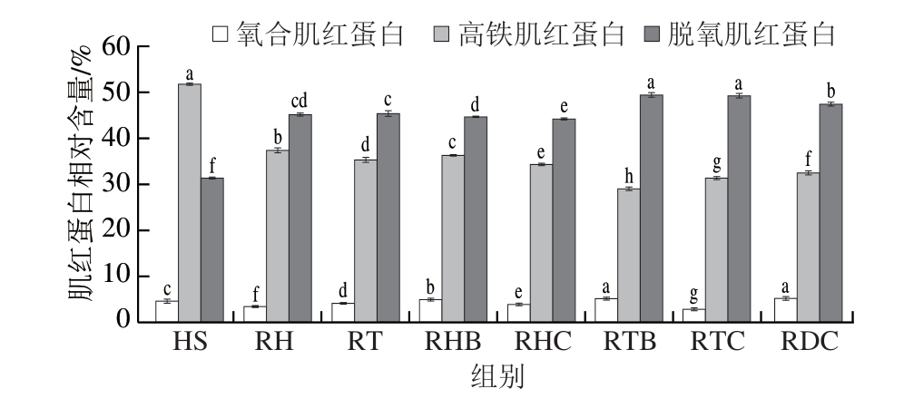 肉制品的色泽特征主要取决于肌红蛋白氧化还原状态,其存在3 种主要形式:氧合肌红蛋白(鲜红色)、高铁肌红蛋白(棕褐色)和脱氧肌红蛋白(紫红色)。热处理会改变肌红蛋白的分子结构和理化性质,从而直接影响肉制品的感官品质[27]。在加工与贮藏过程中,各种理化因素的改变均可能影响肌红蛋白结构,肌红蛋白内的血红素辅基与珠蛋白的结合能力发生改变时将影响血红素辅基中心卟啉铁的价位,从而影响肌红蛋白的氧化还原平衡,最终表现为肉与肉制品色泽的变化[28]。由图6可知,经反复加热后,红烧肉样品的高铁肌红蛋白相对含量显著下降(P<0.05)、脱氧肌红蛋白相对含量显著上升(P<0.05)。这主要是因为在热处理过程中,氧合肌红蛋白中的亚铁离子逐步被氧化成铁离子,其结构转变成脱氧肌红蛋白,这是肉制品色泽劣变的主要原因之一[29]。