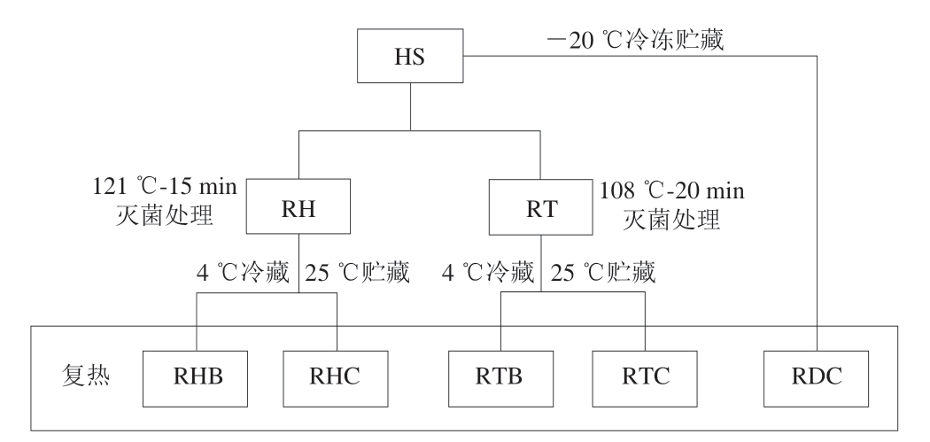 取真空包装红烧肉进行灭菌处理(121 ℃-15 min、108 ℃-20 min)后,4 ℃冷藏或25 ℃贮藏。未进行杀菌的样品直接-20 ℃冷冻贮藏备用。贮藏30 d后取出并平衡至室温,沸水加热6~7 min至肉样中心温度达85 ℃,冰水快速冷却。具体分组如图1所示。