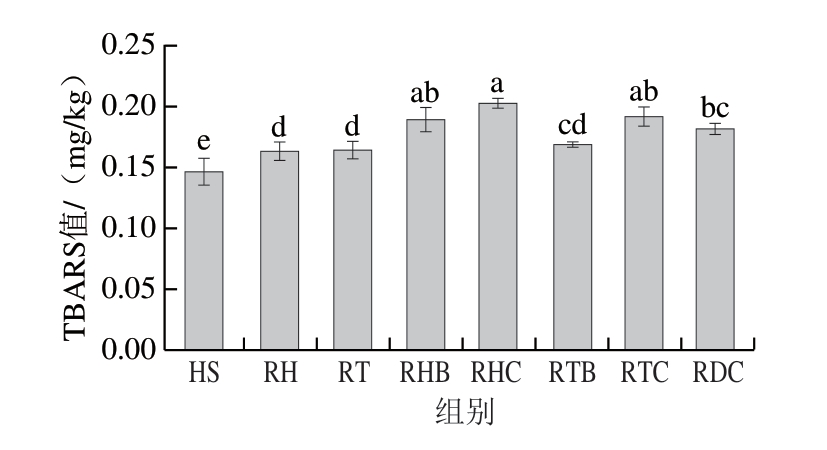 TBARS值作为表征肉制品脂质氧化程度的关键指标,由丙二醛(malondialdehyde,MDA)含量反映氧化程度[16]。由图4可知,HS组TBARS值最低,仅为0.146 7 mg/kg,表明初始氧化程度较低。经 2次加热后各组TBARS值均显著上升(P<0.05),与Li Jianying等[17]关于复热处理促进MDA积累的规律一致。另外,RH、RT组间无显著差异(P>0.05),但两者均显著低于RDC组(P<0.05),可能与后者贮藏期间持续的水分流失加剧脂质自动氧化有关。经3 次加热后,RHC组因高温灭菌呈现最高氧化水平,TBARS值达0.202 9 mg/kg。此结果验证了Nuora等[18]提出的热加工强度与脂质氧化程度呈正相关的理论假设。对比分析显示,低温贮藏的RHB、RTB组TBARS值分别低于常温贮藏的RHC、RTC组,表明低温贮藏可有效抑制脂肪氧化进程。综上,采用适宜杀菌温度结合低温贮藏的复合工艺方案可有效控制延缓肉制品脂质氧化。