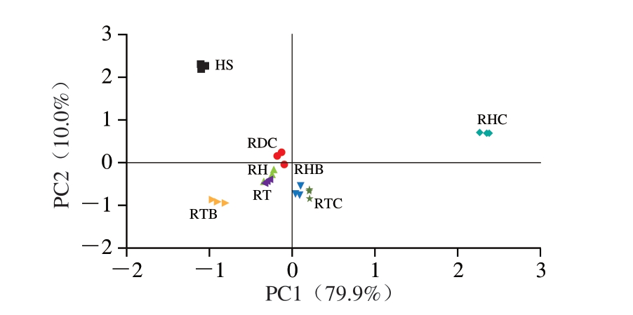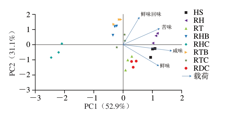 由图11可知,PC1和PC2累计方差贡献率为84%,表明该模型能有效反映样品整体信息并区分不同处理组的味觉特征。其中,HS组与RDC组空间分布位置较为接近,且二者均呈现显著的咸味和鲜味特征,表明直接冷冻贮藏能较好地保持红烧肉的新鲜烹饪风味;RHB组与RTB组聚类特征明显,表明在相同贮藏条件下,样品能保持较高的味觉相似性,表明冷藏可有效缓解高温灭菌导致的味觉差异,该结论与电子鼻气味分析结果一致。