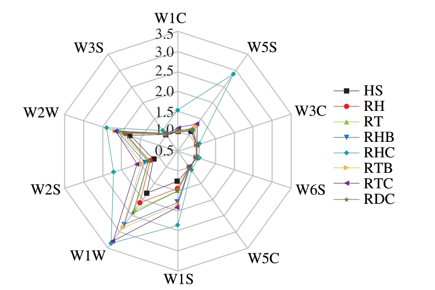 电子鼻技术通过模仿人类嗅觉系统,能够更精准地识别样品间的细微气味差异。由图8可知,W3S传感器响应值最小且组间无明显差异,W6S、W3C传感器响应值在HS与RHC组间存在明显差异。随着加热次数的增加,多数传感器响应值均呈上升趋势,其中RHC组变化最明显。其中,对硫化物敏感的W1W传感器响应明显增强,这可能源于半胱氨酸巯基的释放[30],带皮肉及脂肪组织的存在也会影响其释放与感知。经2 次加热后,W1W传感器响应值依次为RDC组>RT组>RH组,表明速冻贮藏对相应气味物质的影响相对较小;相同贮藏方式(RHB与RTB组、RTC与RHC组)下的W1W传感器响应值较为接近,气味特征相似。随着加热次数的增加,W1W、W3S、W2S传感器响应值逐渐增大,提示热处理过程中猪肉脂质、硫胺素等成分的降解及美拉德反应产生的不饱和醛、酮、醇类物质的增多。叶柯等[31]在猪肉复热品质变化研究中指出,复热后W2S传感器信号强度的升高与脂肪进一步氧化产生的过熟味相关。