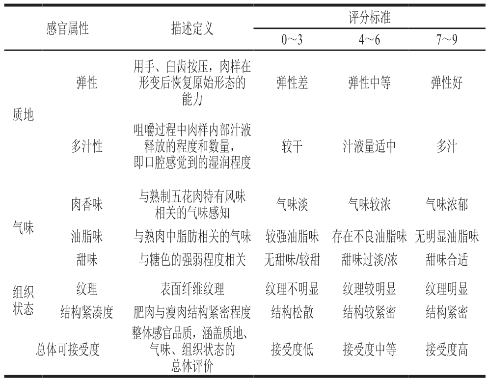 采用定量描述分析法[11]进行红烧肉感官评价,所有样品以统一容器盛装并置于保温箱内,由10 名(5男5女)感官评价经验丰富的食品专业人员在感官分析实验室对复热红烧肉质地(弹性、多汁性)、气味(肉香味、甜味、油脂味)、组织状态(纹理、结构紧凑度)和总体可接受度进行打分,评分采用9 分制,具体标准见表1。