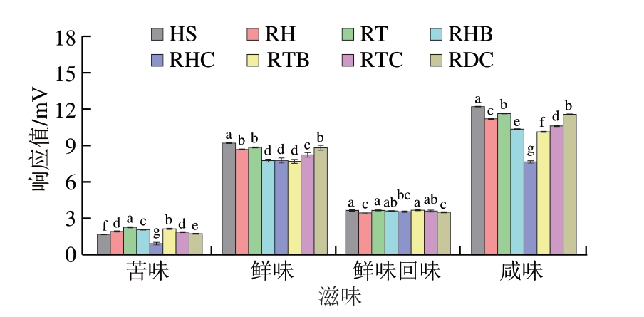 电子舌通过其5 个传感器实现5 种基本味觉属性(鲜味、咸味、苦味、涩味及酸味)及3 种典型余味特征(鲜味回味、苦味回味与涩味回味)的定量检测。其中,涩味、酸味、苦味回味和涩味回味响应值均为负值,表明样品中相应味觉物质浓度低于人类感官系统的识别阈值,在感官评价中被判定为“不可察觉”水平。由图10可知,鲜味物质与咸味物质具有协同作用[34],两者在反复加热过程中的变化趋势一致。其中,HS组咸味和鲜味响应值均为最大,RDC组次之,这可能归因于RDC整体加热程度较低。RHC组苦味、咸味响应值最低,表明高温灭菌后常温贮藏对红烧肉中这2 种味觉特征的削弱作用较为显著。鲜味回味作为反映味觉丰富度的重要指标,其变化趋势与人工脂基膜对风味物质的吸收特性密切相关[35]。随着加热程度加深,鲜味回味显著下降(P<0.05)。HS组鲜味回味响应值最大,显著高于RDC组(P<0.05),表明冷冻对鲜味回味影响较大,这可能主要归因于冷冻-解冻过程中汁液流失对鲜味物质的损耗作用。值得注意的是,RH组鲜味回味较HS组下降显著(P<0.05),推测可能是因为高温灭菌条件下鲜味物质发生转化与美拉德反应中间产物及终产物与鲜味物质发生相互作用,降低鲜味物质的生物利用度及其感官活性,从而导致鲜味回味减弱。