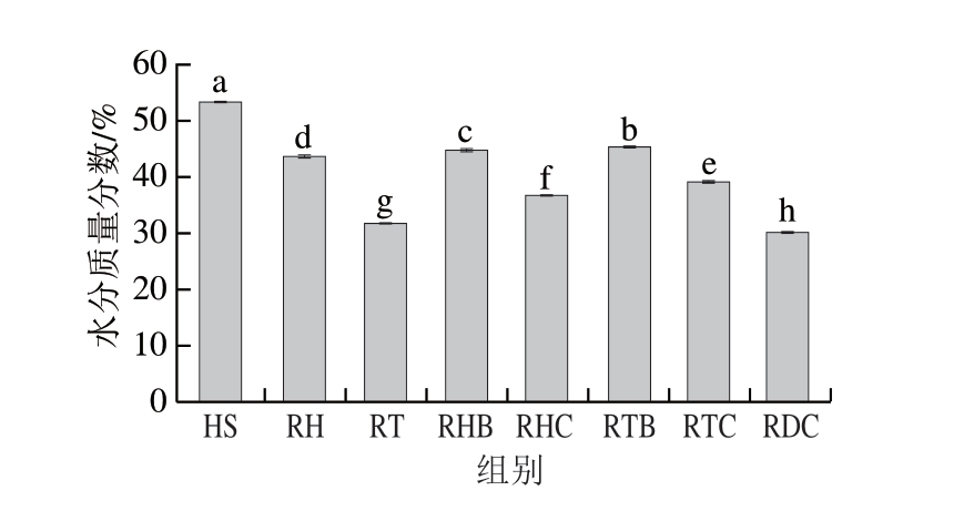 组别L*a*b*HS62.11±0.79d10.41±0.38a13.55±0.80f RH64.64±1.35cd8.46±0.58b17.07±1.40d RT63.80±1.63c7.94±0.53b14.93±1.01e RHB68.03±1.38b8.09±0.59b23.21±0.32a RHC65.27±1.58c8.26±0.67b23.37±0.67a RTB68.74±1.05b6.21±0.15c17.60±0.43cd RTC70.32±0.69b6.58±0.34c21.81±0.65b RDC74.00±0.72a6.96±0.34c18.47±0.57c