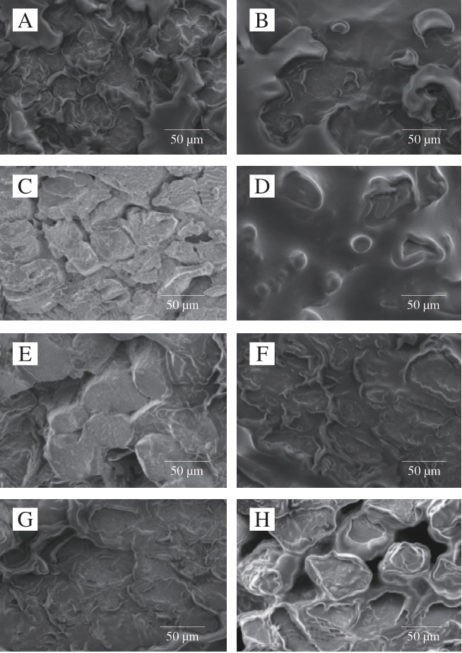 参考杜金等[9]的方法并作修改。将红烧肉样品沿垂直于肌纤维方向切为大小1 cm×1 cm×1 cm的片状,用2.5 g/100 mL戊二醛溶液在4 ℃下固定24 h,蒸馏水洗涤,然后用乙醇(30%、50%、70%、80%、90%、100%,V/V)进行梯度脱水,约10 min,干燥后用银粉导电胶固定在样品台上,在高真空镀膜机内在样品表面镀一层金属膜,在SEM中观察样品微观结构。
