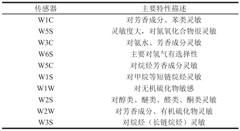 电子鼻传感器阵列包含10 个传感器,其主要特性如表2所示。准确称取3 g切碎混匀的红烧肉样品于电子鼻样品瓶中,封盖室温孵育90 min后检测。测试时间90 s、清洗时间90 s。每组设置3 个平行样品,选取78~82 s稳定区间的响应值进行分析。