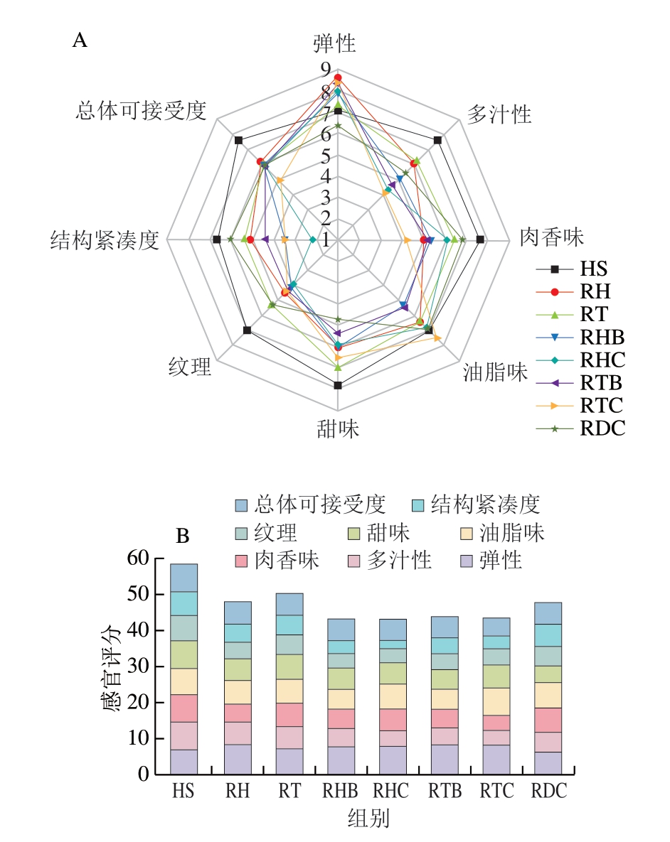 图7 红烧肉感官评分雷达图(A)与堆积图(B)