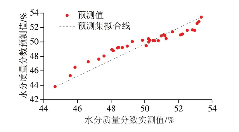 图4 鸡肉火腿肠水分含量PLSR模型预测值与实际值拟合图