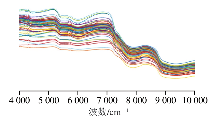 近红外光谱基于—CH、—NH、—OH等官能团振动产生的泛音与组合吸收特性获取样品有机物组分和结构信息,实现快速定性和定量分析[15-16]。其核心优势在于无需复杂前处理、避免有毒溶剂使用等,且单次扫描可同步测定脂肪、蛋白质等多项指标[17],其分析精度与传统化学方法相当,兼具无损、高效、环保等优点[18]。将近红外光谱仪预热30 min后,使用酒精棉清洁检测平台。样品采集前先进行背景校正以消除干扰;样品检测时,确保完全覆盖光斑区域,每个样品重复扫描3 次,取平均光谱[19]。参数设置:扫描次数82、分辨率16 cm-1、数据间隔7.714 cm-1、扫描范围4 000~10 000 cm-1,环境温度和相对湿度分别为(25±1)℃和(30±5)%。