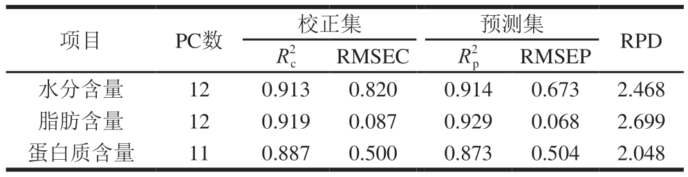 表2 鸡肉火腿肠水分、脂肪和蛋白质含量PLSR模型分析结果