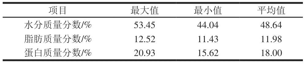项目最大值最小值平均值水分质量分数/%53.4544.0448.64脂肪质量分数/%12.5211.4311.98蛋白质量分数/%20.9315.6218.00