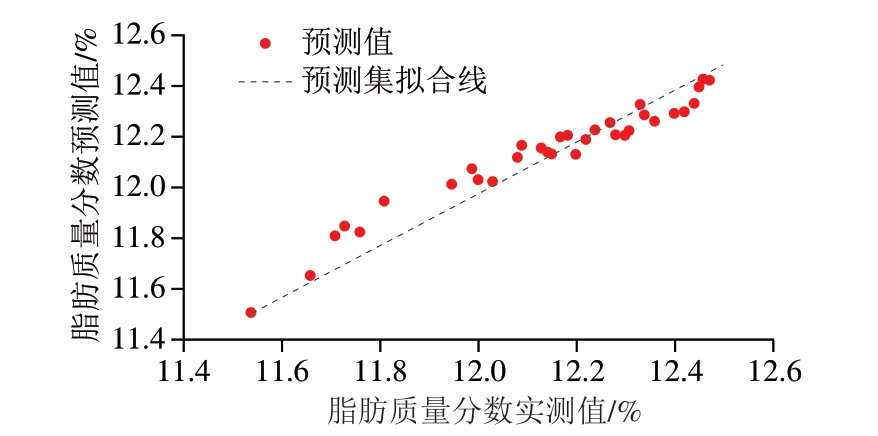 图5 鸡肉火腿肠脂肪含量PLSR模型预测值与实际值拟合图