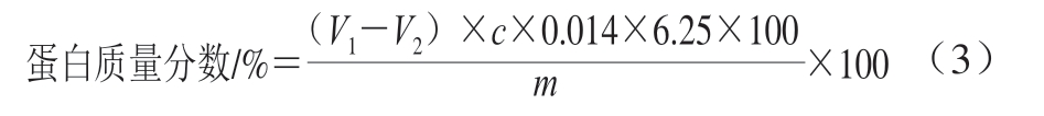 参考万丹娜[14]的凯氏定氮法并稍作修改。称取鸡肉肠样品2.5 g,加入20 mL去离子水,匀浆、静置、离心、过滤后。取样品混合液10 mL和氧化镁悬浊液(现配现用)10 mL倒入消化管中,于凯氏定氮仪上蒸馏,经过清洗、颜色校正、测试空白等操作后测定。蛋白质含量按式(3)计算: