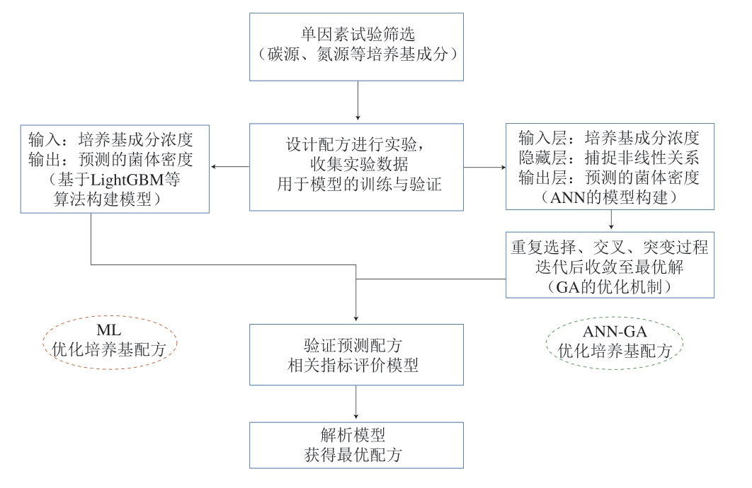 图1 ML与ANN-GA优化培养基配方路线图