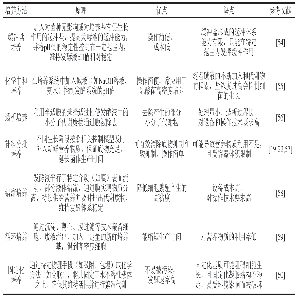 培养方法原理优点缺点参考文献缓冲盐培养加入对菌种无影响或对培养基有促生长作用的缓冲盐,提高发酵液的缓冲能力,并将pH值的稳定性控制在一定范围内,维持发酵液pH值相对稳定操作简便,成本低缓冲盐形成的缓冲体系能力有限,只能在特定范围内发挥缓冲作用[54]化学中和培养在培养系统中加入碱液(如NaOH溶液、氨水)控制发酵系统的pH值操作简便,常应用于乳酸菌高密度培养随着碱液的不断加入和代谢物的积累,盐浓度过高会抑制细菌的生长[55]透析培养 利用半透膜的选择透过性使发酵液中的小分子代谢废物通过膜被除去去除产生的部分小分子代谢物处理量小、透析过程长,对设备和操作技术要求高[56]补料分批培养不同生长阶段按照相关控制模型及时补入新鲜营养物质,保证底物充足,延长菌体生产时间可有效消除底物抑制和酸抑制,操作简单可能导致营养物质利用不足,且受容器体积限制[19-22,57]错流培养发酵液平行于特定介质(如膜)表面流动,部分液体错流,通过膜实现物质分离,持续供给营养并及时排出代谢废物,维持发酵体系稳定降低细胞繁殖产生的高黏度设备成本高,对操作技术要求高[58]循环培养通过沉淀、离心、膜过滤等技术截留细胞,废液流出,加入一定量的新鲜培养基,得到高密度细胞能缩短生产时间对营养物质的利用率低[59]固定化培养通过特定物理手段(如吸附、包埋)或化学方法(如交联),将其固定于水不溶性载体之上,确保其维持活性并进行繁殖代谢不易被污染,发酵速率高固定化基质可能阻碍细胞生长,且固定化凝胶结构不稳定,易受环境影响而被破坏[60]