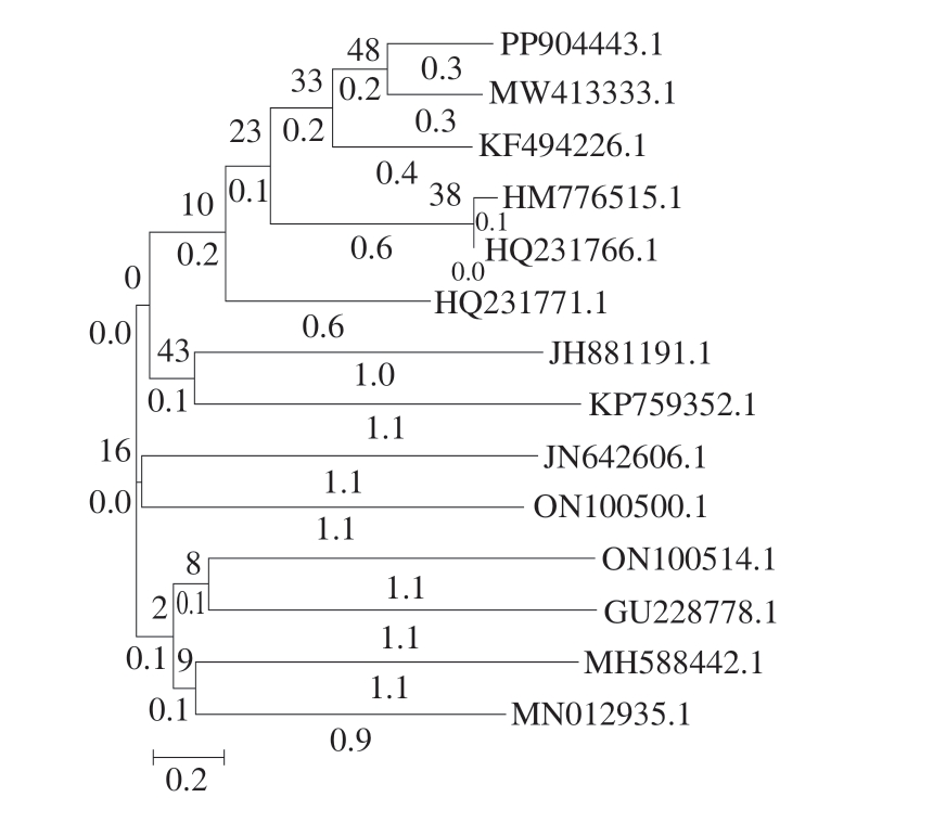 分支(节点)处为Bootstrap值(自展值),值越高,表明该分支在多次抽样中越稳定,可靠性越强;分支上的数值表示进化距离,数值越大,基因间的差异越大,进化关系越远。