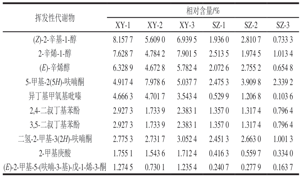 挥发性代谢物相对含量/%XY-1XY-2XY-3SZ-1SZ-2SZ-3(Z)-2-辛基-1-醇8.157 75.609 06.939 51.936 02.810 70.733 3 2-辛烯-1-醇7.628 74.784 27.901 52.513 51.974 51.013 4(E)-辛烯醇6.328 94.672 85.782 42.072 62.755 20.654 8 5-甲基-2(5H)-呋喃酮4.917 47.978 65.037 72.475 33.909 82.339 2异丁基甲氧基吡嗪4.666 34.701 73.543 40.529 91.206 80.103 6 2,4-二叔丁基苯酚2.927 31.733 92.383 11.357 01.317 40.796 4 3,5-二叔丁基苯酚2.927 31.733 92.383 11.357 01.317 40.796 4二氢-2-甲基-3(2H)-呋喃酮2.775 32.731 73.052 42.451 32.663 01.001 3 2-甲基庚酸1.755 11.543 61.712 40.416 30.559 70.334 0(E)-2-甲基-5-(呋喃-3-基)-戊-1-烯-3-酮 1.274 50.730 11.235 40.240 70.277 90.163 7