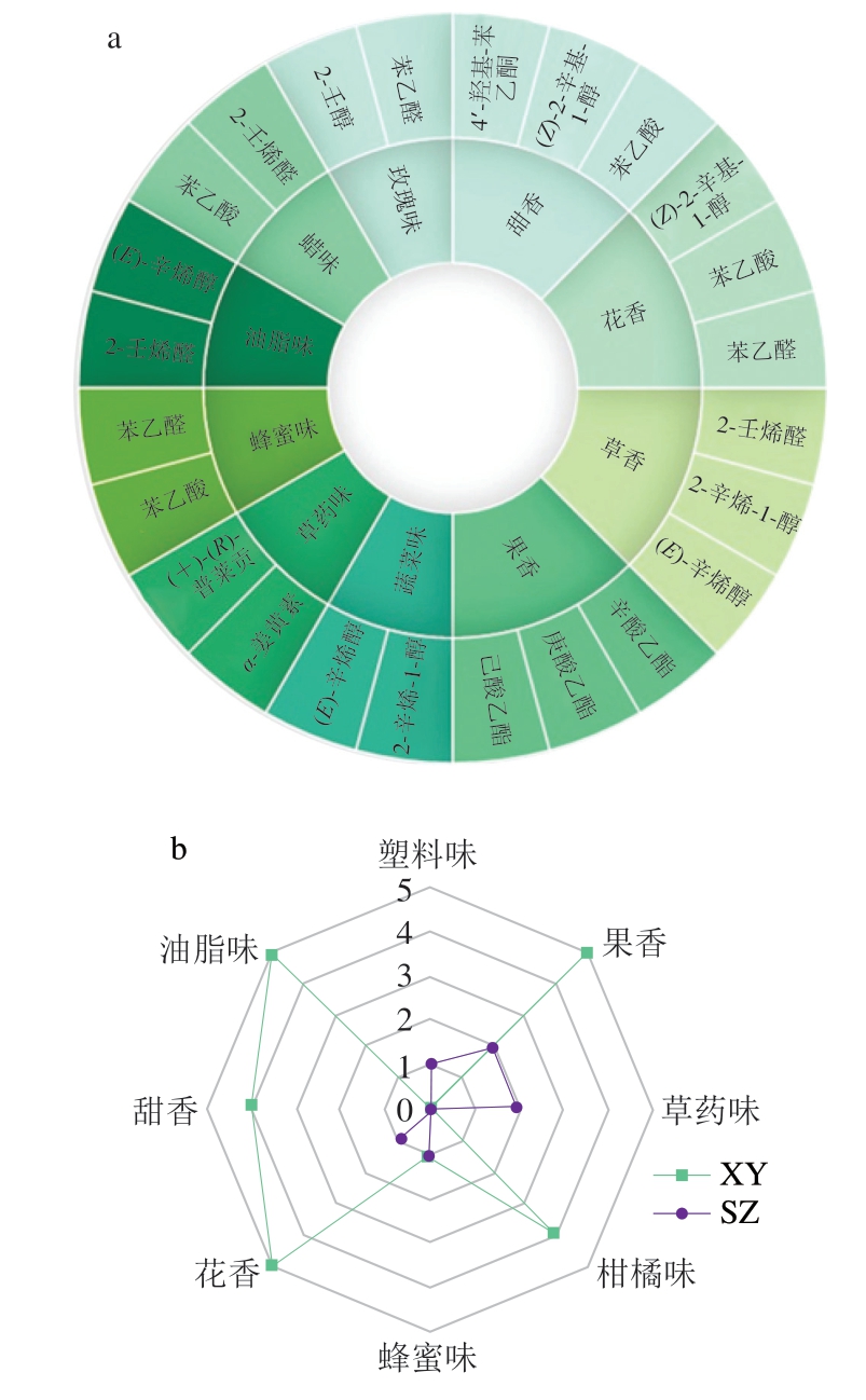 风味特征的差异主要体现在感官属性的动态变化上。在鲜牦牛肉中,根据感官注释频次筛选出的前10 位特征风味依次为甜香、花香、草香、果香、蔬菜味、草药味、蜂蜜味、油脂味、蜡味、玫瑰味。其中,甜香、花香、草香、果香作为主导特征香气,各由3 种关键挥发性化合物贡献(图2a)。煮制加工后,油脂香、甜香、柑橘味、花香和果香减弱或消失,同时塑料味和草药味增强(图2b)。