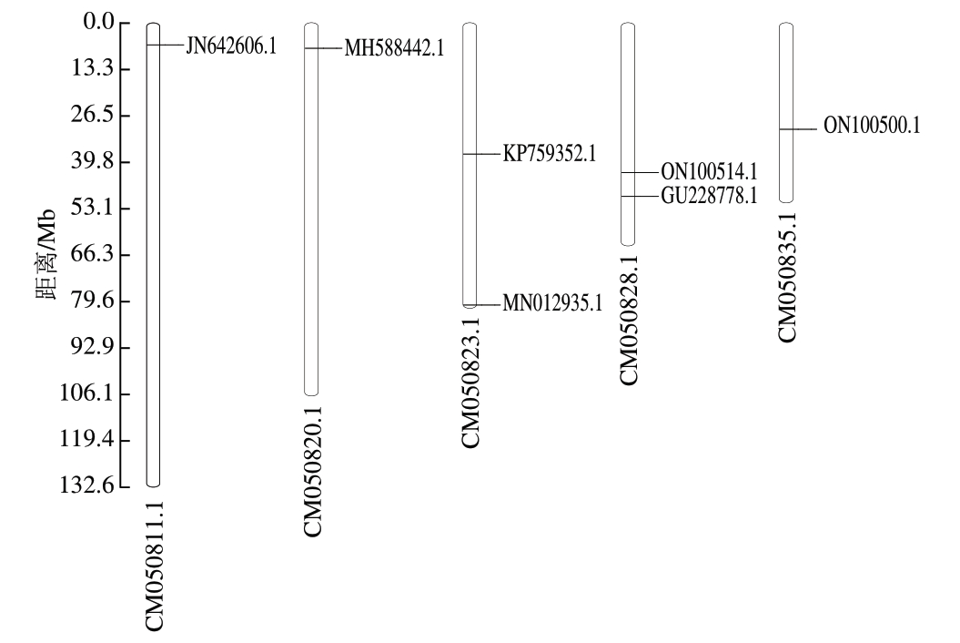 利用在线工具DNA RNA Codons Translator-Amino Acid Genetic Code Online Converter将从NCBI获取的RNA序列转换为DNA序列。使用Notepad++软件编辑fasta格式文件,并借助正则表达式删除文档中全部重复行,打开“查找和替换”窗口,选择“替换”选项卡,在“查找内容”框中输入“(.+)\1+”,“替换为”框留空,勾选“正则表达式”选项后点击“全部替换”。基于MEGA 11软件完成多序列比对并构建基因进化树。使用TBtools-II v2.210软件中的基因组定位功能进行染色体定位并生成基因分布图谱。