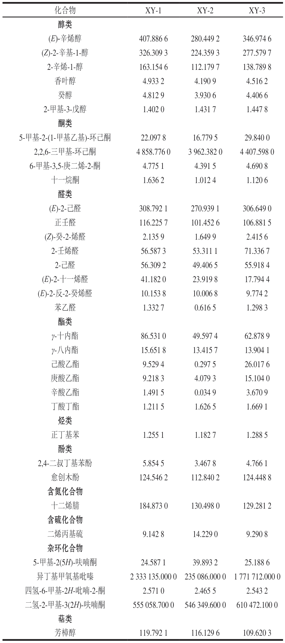 化合物XY-1XY-2XY-3醇类(E)-辛烯醇407.886 6280.449 2346.974 6(Z)-2-辛基-1-醇326.309 3224.359 3277.579 7 2-辛烯-1-醇163.154 6112.179 7138.789 8香叶醇4.933 24.190 94.516 2癸醇4.812 93.930 64.406 6 2-甲基-3-戊醇1.402 01.431 71.447 8酮类5-甲基-2-(1-甲基乙基)-环己酮22.097 816.779 529.840 0 2,2,6-三甲基-环己酮4 858.776 03 962.382 04 407.598 0 6-甲基-3,5-庚二烯-2-酮4.775 14.391 54.690 8十一烷酮1.636 21.012 41.120 6醛类(E)-2-己醛308.792 1270.939 1306.649 0正壬醛116.225 7101.452 6106.881 5(Z)-癸-2-烯醛2.135 91.649 92.415 6 2-壬烯醛56.587 353.311 171.336 7 2-己醛56.309 249.406 555.918 4(E)-2-十一烯醛41.182 023.919 817.794 4(E)-2-反-2-癸烯醛10.153 810.006 89.774 2苯乙醛1.332 70.616 51.298 3酯类γ-十内酯86.531 049.597 462.878 9 γ-八内酯15.651 813.415 713.904 1己酸乙酯9.529 40.297 526.017 6庚酸乙酯9.218 34.079 315.104 0辛酸乙酯1.491 50.034 93.670 9丁酸丁酯1.211 51.626 51.669 1烃类正丁基苯1.255 11.182 71.288 5酚类2,4-二叔丁基苯酚5.854 53.467 84.766 1愈创木酚124.546 2112.840 2124.448 8含氮化合物十二烯腈184.873 0130.498 0129.281 2含硫化合物二烯丙基硫9.142 814.229 09.290 8杂环化合物5-甲基-2(5H)-呋喃酮24.587 139.893 225.188 6异丁基甲氧基吡嗪2 333 135.000 0 235 086.000 0 1 771 712.000 0四氢-6-甲基-2H-吡喃-2-酮2.571 02.465 52.543 2二氢-2-甲基-3(2H)-呋喃酮555 058.700 0 546 349.600 0 610 472.100 0萜类芳樟醇119.792 1116.129 6109.620 3