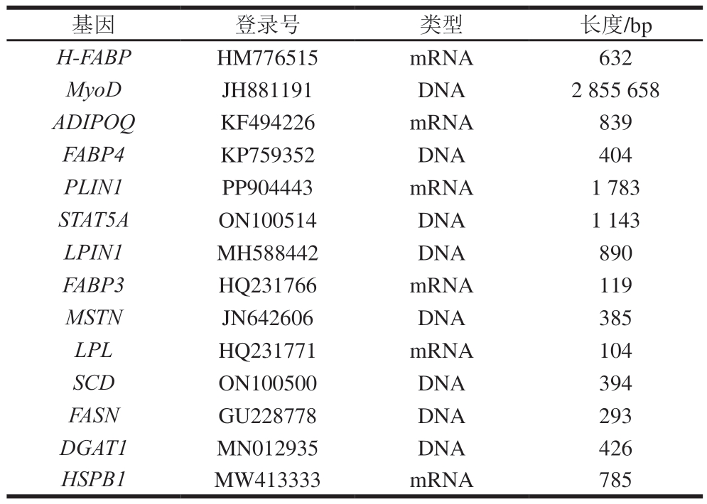 基因登录号类型长度/bp H-FABPHM776515mRNA632 MyoDJH881191DNA2 855 658 ADIPOQKF494226mRNA839 FABP4KP759352DNA404 PLIN1PP904443mRNA1 783 STAT5AON100514DNA1 143 LPIN1MH588442DNA890 FABP3HQ231766mRNA119 MSTNJN642606DNA385 LPLHQ231771mRNA104 SCDON100500DNA394 FASNGU228778DNA293 DGAT1MN012935DNA426 HSPB1MW413333mRNA785