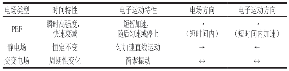 电场类型时间特性电子运动特性电场方向电子运动方向PEF瞬时高强度,快速衰减短暂加速,随后匀速或停止→→(短时间内加速)静电场恒定不变匀加速直线运动→←交变电场周期性变化简谐振动↔↔(短时间内)