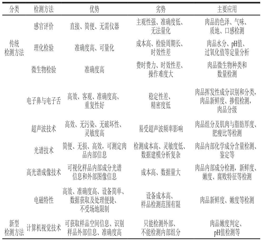 表1 肉类新鲜度检测技术性能比较