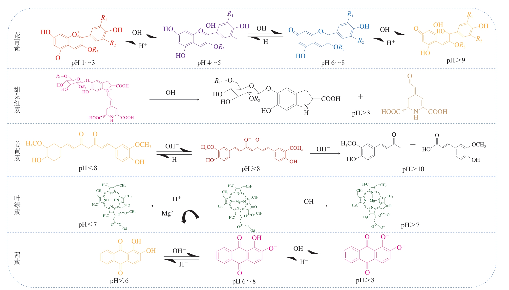 图2 不同pH值下天然色素的结构和颜色变化