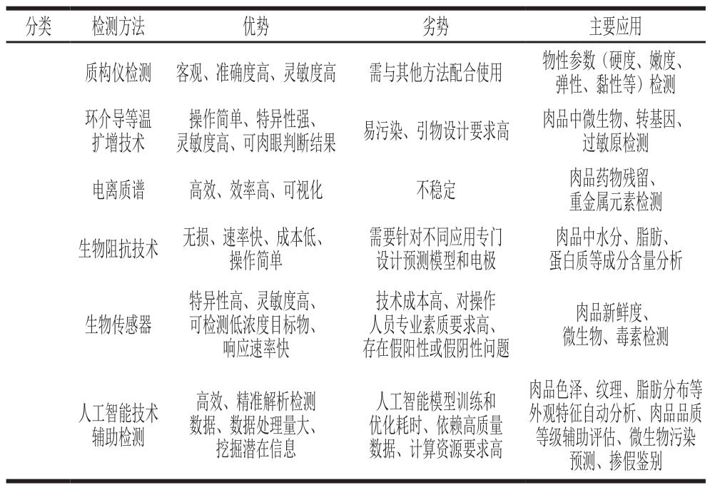 分类检测方法优势劣势主要应用质构仪检测 客观、准确度高、灵敏度高需与其他方法配合使用物性参数(硬度、嫩度、弹性、黏性等)检测环介导等温扩增技术灵敏度高、可肉眼判断结果易污染、引物设计要求高肉品中微生物、转基因、过敏原检测电离质谱高效、效率高、可视化不稳定肉品药物残留、重金属元素检测生物阻抗技术 无损、速率快、成本低、操作简单操作简单、特异性强、需要针对不同应用专门设计预测模型和电极肉品中水分、脂肪、蛋白质等成分含量分析生物传感器特异性高、灵敏度高、可检测低浓度目标物、响应速率快技术成本高、对操作人员专业素质要求高、存在假阳性或假阴性问题肉品新鲜度、微生物、毒素检测人工智能技术辅助检测高效、精准解析检测数据、数据处理量大、挖掘潜在信息人工智能模型训练和优化耗时、依赖高质量数据、计算资源要求高肉品色泽、纹理、脂肪分布等外观特征自动分析、肉品品质等级辅助评估、微生物污染预测、掺假鉴别