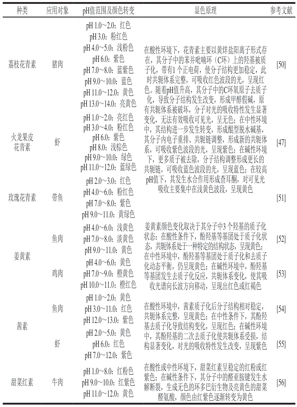 基于天然色素的智能标签利用其在酸碱环境中质子化/去质子化反应机制,已被广泛应用于肉品新鲜度智能指示包装的研发[45-46],旨在解决人工合成染料带来的安全隐患。表3为制备可视化智能标签常用的天然色素染料种类及应用。Liu Chang等[47]以火龙果皮花青素提取物、Zn2+和果胶为原料制备复合薄膜,其在pH 1.0~12.0缓冲溶液中呈现由亮红色(pH 1.0~2.0)逐渐过度为粉红色(pH 3.0~4.0)、紫色(pH 6.0)、浅棕色(pH 8.0)、绿色(pH 9.0~10.0)至蓝绿色(pH 11.0~12.0)的颜色变化,在5 ℃贮藏120 h的虾新鲜度监测应用中,随包装内TVB-N含量增加,标签颜色由紫色变为绿色,表现出良好的指示性能,显示出天然色素在新鲜度可视化智能包装中的应用前景。为提高花青素稳定性及变色灵敏度,Li Ziao等[48]将紫甘薯花青素/壳聚糖凝胶珠和羧甲基纤维素钠/阳离子大豆分离蛋白制备成多层凝胶珠,在pH 3.0~11.0范围内,凝胶珠颜色由红色逐渐变为黄色,具有良好的pH值敏感性,可用于4 ℃贮藏猪肉新鲜度监测。Song Shuang等[49]制备出一种含有花青素共色素(聚赖氨酸、儿茶素和阿魏酸)复合物的马铃薯淀粉/卡拉胶pH值敏感智能膜,与纯花青素复合膜相比,引入的共色素复合物可通过π-π堆积和氢键相互作用显著提高花青素的保留率和稳定性,对TVB-N响应的颜色变化更明显,当环境pH值由2.0升至7.0时,薄膜颜色由红色变为灰粉色,pH值由8.0升至13.0时,薄膜颜色由灰蓝色变为黄褐色,显示出在肉品新鲜度监测中的应用潜力。