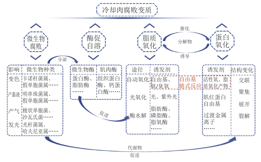 冷却肉化学组分主要包括约75%水、19%蛋白质、2.5%脂肪、1.2%碳水化合物、1.65%含氮化合物及少量矿物质及微量元素(钙、磷、钠、钾、氯、镁、铁、铜和锌等)。这些营养成分极易成为微生物生长基质,导致肉品腐败变质,不仅降低食用品质,还可能引发食品安全风险[12]。冷却肉的腐败变质机制(图1)主要涉及4 种途径:微生物污染、酶促自溶、脂质氧化和蛋白质氧化[13-14]。