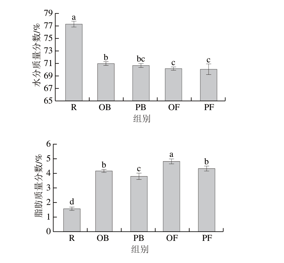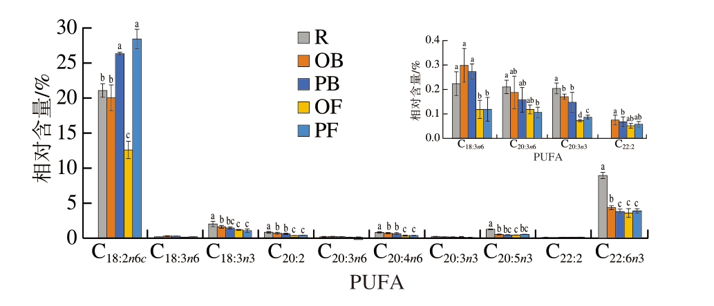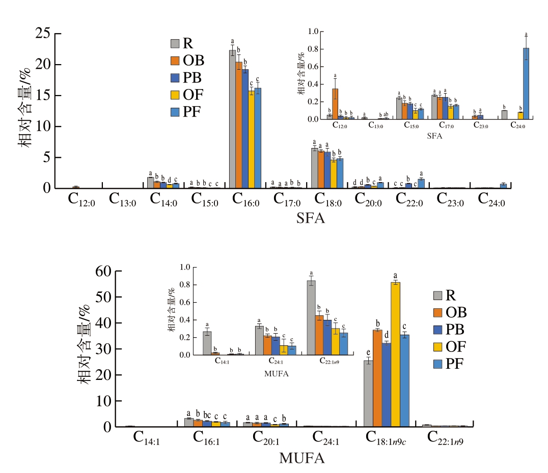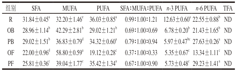 组别SFAMUFAPUFASFA∶MUFA∶PUFAn-3 PUFAn-6 PUFATFA R31.84±0.45a32.20±1.46e36.03±0.85a0.99∶1.00∶1.2112.63±0.60a22.55±0.88bND OB28.96±1.14b42.29±2.81b29.02±1.21b0.69∶1.00∶0.696.78±0.20b21.43±1.65bND PB29.02±1.51b36.83±0.79d34.32±0.60a0.79∶1.00∶0.945.97±0.47bc27.63±0.26aND OF22.00±0.96d58.80±0.59a19.12±0.28c0.37∶1.00∶0.335.35±0.67c13.34±1.11cND PF25.81±0.36c39.04±1.77c35.42±1.34a0.67∶1.00∶0.905.73±0.48c29.23±1.41aND