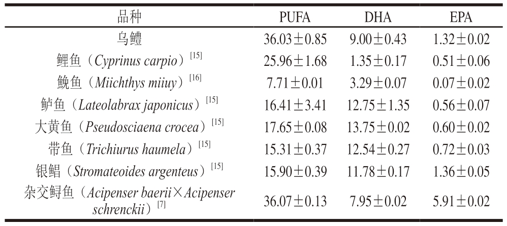 乌鳢全鱼脂肪、蛋白质及灰分质量分数分别为(4.19±0.01)%、(13.36±0.13)%和(3.73±0.13)%,脂肪含量高于鲤鱼、鲈鱼、鳙鱼等淡水鱼[15]。由表3可知,乌鳢肌肉PUFA占总脂肪酸含量的36.03%,高于淡水养殖的鲤鱼、海水养殖的鲈鱼及鮸鱼、大黄鱼、带鱼等野生海水鱼,接近鲟鱼[7,15-16]。乌鳢肌肉DHA质量分数(9.00%)高于鲤鱼和鮸鱼,与海水养殖的银鲳和带鱼接近;EPA质量分数(1.32%)高于鲤鱼、鲈鱼、鮸鱼、大黄鱼和带鱼[15-16]。综上,乌鳢可作为EPA和DHA的优质食物来源。