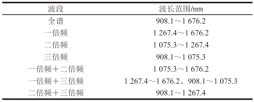 波段波长范围/nm全谱908.1~1 676.2一倍频1 267.4~1 676.2二倍频1 075.3~1 267.4三倍频908.1~1 075.3一倍频+二倍频1 075.3~1 676.2一倍频+三倍频1 267.4~1 676.2、908.1~1 075.3二倍频+三倍频908.1~1 267.4
