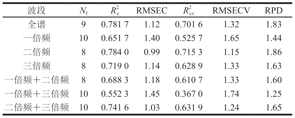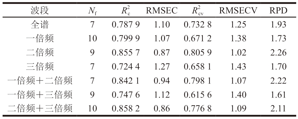 波段NfR2 cRMSECR2 cvRMSECVRPD全谱70.787 91.100.732 81.251.93一倍频100.799 91.070.671 21.381.73二倍频90.855 70.870.805 91.022.26三倍频70.724 41.270.658 11.431.70一倍频+二倍频70.842 10.940.798 11.072.22一倍频+三倍频90.747 61.120.615 61.401.61二倍频+三倍频100.858 20.860.776 81.092.11