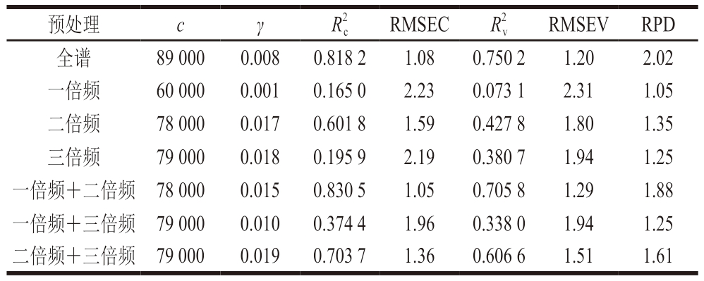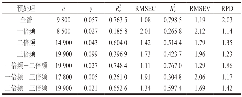 如表9所示,基于全谱数据所建模型的R2c、R2v分别为0.763 5、0.798 5,RMSEC、RMSECV分别为1.08、1.19,RPD为2.03,模型对应的c、γ分别为9 800、0.057;该结果表明,对于切碎猪肉样品建立水分含量SVR定量分析模型,基于全谱数据所建模型具有较好的相关性、精密度、准确度和预测性能。