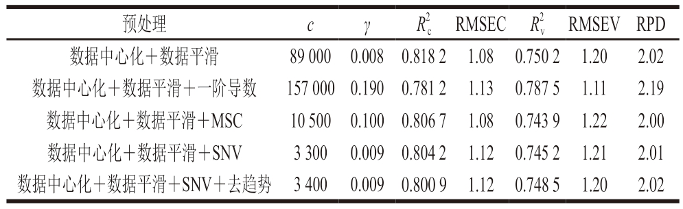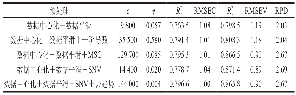 基于切碎猪肉样品LVFNIR光谱的全谱SVR模型进行预处理优化,如表10所示,当预处理方法为数据中心化+数据平滑+SNV时,优化模型的R2c、R2 cv分别为0.778 7、0.871 4,RMSEC、RMSECV分别为1.04、0.89,RPD为2.69,模型对应的c、γ分别为14 400、0.020;在各模型中,数据中心化+数据平滑+SNV预处理的效果最佳。