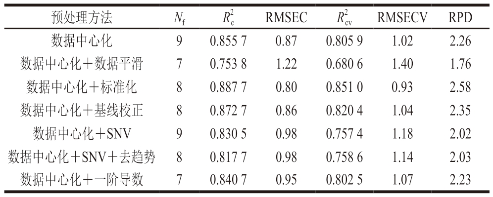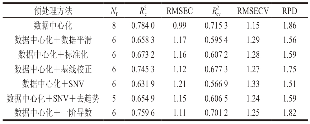 分别为0.784 0、0.715 3,RMSEC、RMSECV分别为0.99、1.15,RPD为1.86,在各模型中,数据中心化预处理的效果最佳。