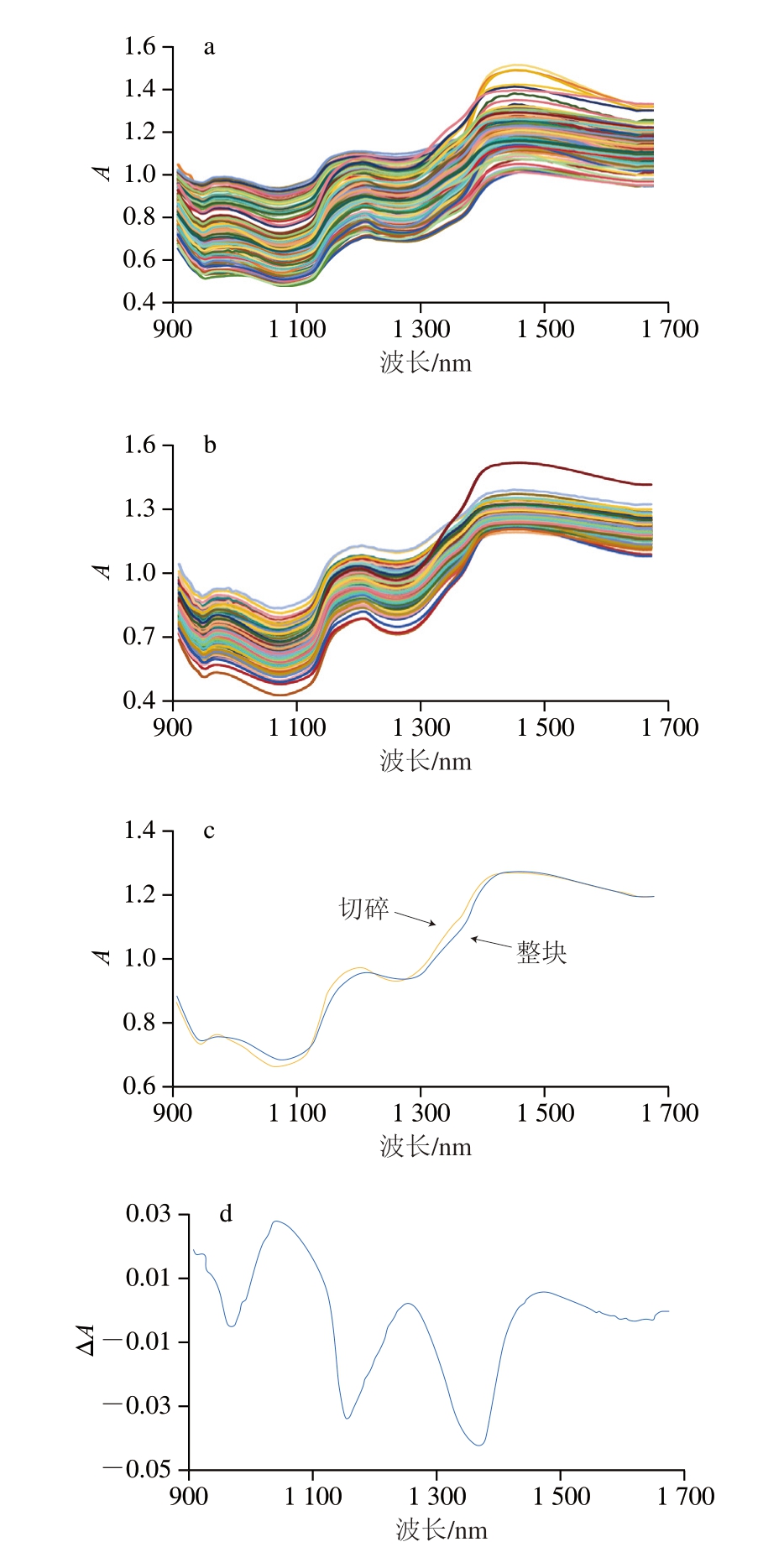 整块猪肉样品的LVFNIR光谱如图1a所示。为了增强样品的均匀性、进一步获取猪肉样品内部的光谱信息,将猪肉样品切碎后采集LVFNIR光谱,如图1b所示。为进一步从统计学角度研究2 种状态猪肉样品近红外光谱的区别,分别计算整块猪肉样品的LVFNIR平均光谱和切碎猪肉样品的LVFNIR平均光谱,并计算二者差谱,分别如图1c、d所示。由图1a、b可知,整块、切碎猪肉样品的LVFNIR光谱皆呈宽吸收峰,主要原因是猪肉样品具有较高的水分含量。由图1c可知,整块猪肉样品和切碎猪肉样品LVFNIR光谱的平均光谱存在差异,差谱在976.2、1 162.1、1 378.9 nm出现波谷,分别对应O—H伸缩振动三倍频、O—H伸缩振动二倍频与O—H弯曲振动合频、O—H伸缩振动二倍频,说明切碎样品的表面有更多水分,原因是切碎使猪肉内部的部分水分外溢至表面。