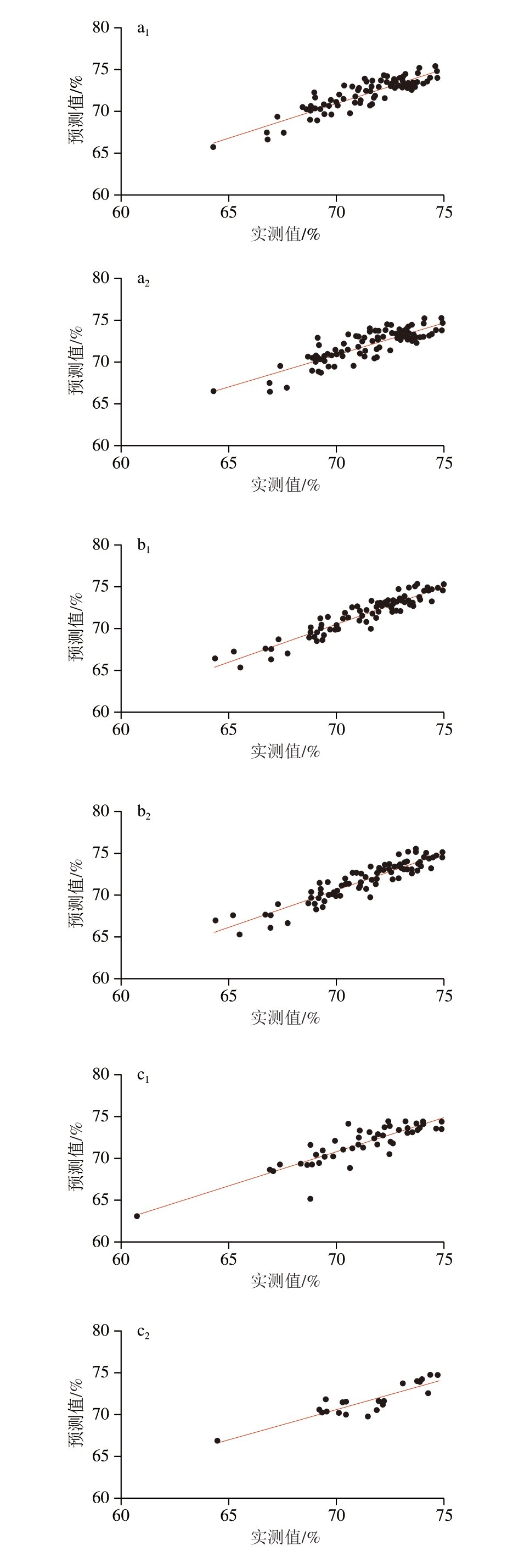 4 个基于LVFNIR光谱的猪肉水分含量优化模型的校正数据、验证数据的预测值-实测值相关性如图2所示。