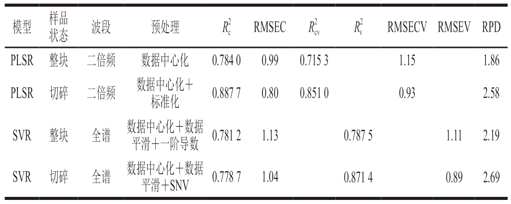 模型样品状态波段预处理R2 cRMSECR2 cvR2 vRMSECVRMSEVRPD PLSR整块二倍频数据中心化0.784 00.990.715 31.151.86 PLSR切碎二倍频数据中心化+标准化0.887 70.800.851 00.932.58 SVR整块全谱数据中心化+数据平滑+一阶导数0.781 21.130.787 51.112.19 SVR切碎全谱数据中心化+数据平滑+SNV0.778 71.040.871 40.892.69