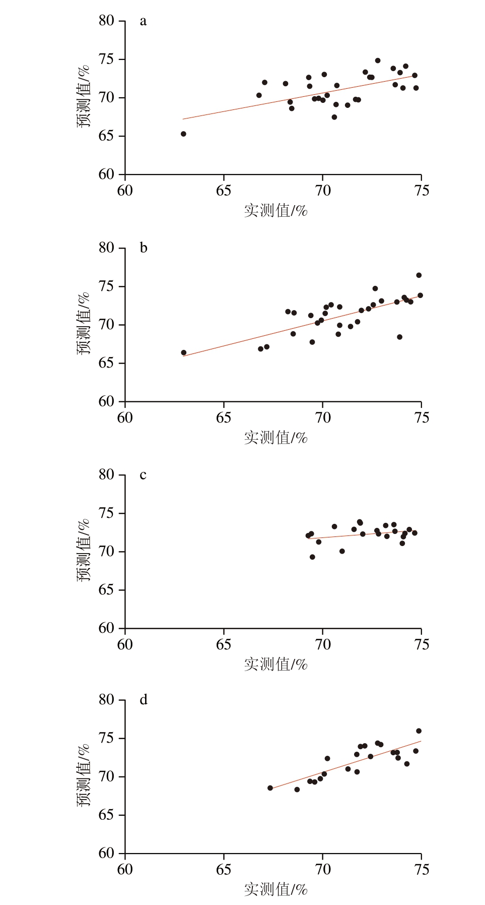 4 个外部验证集的猪肉样品水分含量外部验证数据预测值-实测值相关性如图3所示。
