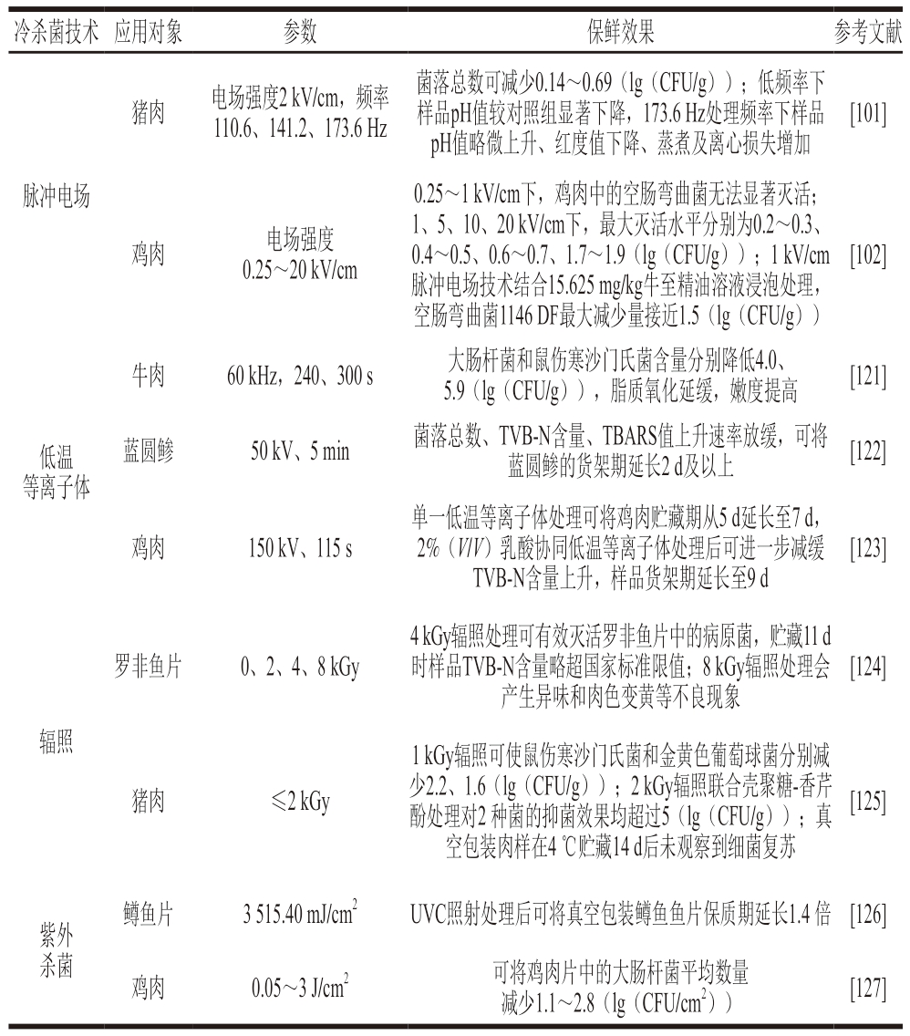 冷杀菌技术应用对象参数保鲜效果参考文献猪肉电场强度2 kV/cm,频率110.6、141.2、173.6 Hz菌落总数可减少0.14~0.69(lg(CFU/g));低频率下样品pH值较对照组显著下降,173.6 Hz处理频率下样品pH值略微上升、红度值下降、蒸煮及离心损失增加[101]脉冲电场鸡肉电场强度0.25~20 kV/cm 0.25~1 kV/cm下,鸡肉中的空肠弯曲菌无法显著灭活;1、5、10、20 kV/cm下,最大灭活水平分别为0.2~0.3、0.4~0.5、0.6~0.7、1.7~1.9(lg(CFU/g));1 kV/cm脉冲电场技术结合15.625 mg/kg牛至精油溶液浸泡处理,空肠弯曲菌1146 DF最大减少量接近1.5(lg(CFU/g))[102]牛肉60 kHz,240、300 s大肠杆菌和鼠伤寒沙门氏菌含量分别降低4.0、5.9(lg(CFU/g)),脂质氧化延缓,嫩度提高[121]低温等离子体蓝圆鲹50 kV、5 min菌落总数、TVB-N含量、TBARS值上升速率放缓,可将蓝圆鲹的货架期延长2 d及以上[122]鸡肉150 kV、115 s单一低温等离子体处理可将鸡肉贮藏期从5 d延长至7 d,2%(V/V)乳酸协同低温等离子体处理后可进一步减缓TVB-N含量上升,样品货架期延长至9 d[123]罗非鱼片0、2、4、8 kGy 4 kGy辐照处理可有效灭活罗非鱼片中的病原菌,贮藏11 d时样品TVB-N含量略超国家标准限值;8 kGy辐照处理会产生异味和肉色变黄等不良现象[124]辐照猪肉≤2 kGy 1 kGy辐照可使鼠伤寒沙门氏菌和金黄色葡萄球菌分别减少2.2、1.6(lg(CFU/g));2 kGy辐照联合壳聚糖-香芹酚处理对2 种菌的抑菌效果均超过5(lg(CFU/g));真空包装肉样在4 ℃贮藏14 d后未观察到细菌复苏[125]紫外杀菌鳟鱼片3 515.40 mJ/cm2UVC照射处理后可将真空包装鳟鱼鱼片保质期延长1.4 倍[126]鸡肉0.05~3 J/cm2可将鸡肉片中的大肠杆菌平均数量减少1.1~2.8(lg(CFU/cm2))[127]