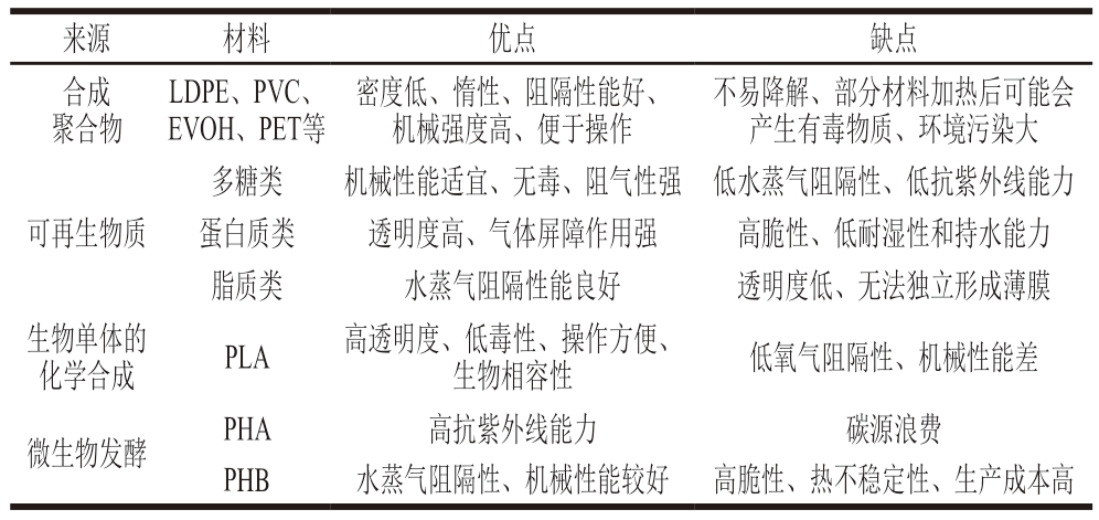 来源材料优点缺点合成聚合物LDPE、PVC、EVOH、PET等密度低、惰性、阻隔性能好、机械强度高、便于操作不易降解、部分材料加热后可能会产生有毒物质、环境污染大多糖类机械性能适宜、无毒、阻气性强低水蒸气阻隔性、低抗紫外线能力蛋白质类透明度高、气体屏障作用强高脆性、低耐湿性和持水能力脂质类水蒸气阻隔性能良好透明度低、无法独立形成薄膜生物单体的可再生物质化学合成PLA高透明度、低毒性、操作方便、生物相容性低氧气阻隔性、机械性能差微生物发酵PHA高抗紫外线能力碳源浪费PHB水蒸气阻隔性、机械性能较好高脆性、热不稳定性、生产成本高