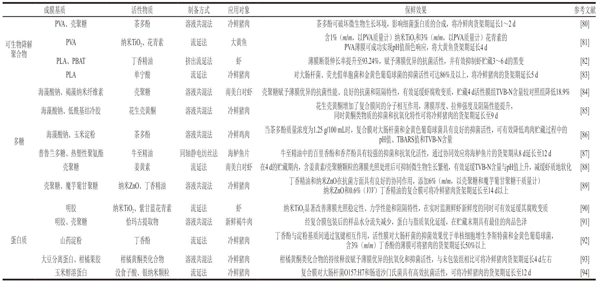 成膜基质活性物质制备方式应用对象保鲜效果参考文献可生物降解聚合物PVA、壳聚糖茶多酚溶液共混法冷鲜猪肉茶多酚可破坏微生物生长坏境,影响细菌蛋白质的合成,将冷鲜肉货架期延长1~2 d[80]PVA纳米TiO2、花青素流延法大黄鱼含1%(m/m,以PVA质量计)纳米TiO2和3%(m/m,以PVA质量计)花青素的PVA薄膜可成功实现pH值颜色响应,将大黄鱼货架期延长4 d[81]PLA、PBAT丁香精油挤出流延法虾薄膜断裂伸长率提升至93.24%,赋予薄膜优异的抗菌活性,并有效抑制虾贮藏3~6 d的黑变[82]PLA单宁酸流延法冷鲜猪肉对大肠杆菌、荧光假单胞菌和金黄色葡萄球菌的抑菌活性可达86%及以上,将冷鲜猪肉的货架期延长5 d[83]海藻酸钠、褐藻纳米纤维素壳聚糖溶液共混法南美白对虾壳聚糖赋予薄膜优异的抗菌性能、良好的抗菌和阻隔特性,有效延缓虾腐败变质,贮藏4 d活性膜组TVB-N含量较对照组降低18.9%[84]海藻酸钠、低酰基结冷胶花生壳黄酮溶液共混法冷鲜猪肉花生壳黄酮增加了复合膜间的分子相互作用,薄膜厚度、拉伸强度及阻隔性能提升,同时黄酮类物质的抑菌和抗氧化特性可将冷鲜猪肉的货架期延长至9 d[85]多糖海藻酸钠、玉米淀粉茶多酚溶液共混法冷鲜鸡肉当茶多酚质量浓度为1.25 g/100 mL时,复合膜对大肠杆菌和金黄色葡萄球菌具有良好的抑菌活性,可有效降低鸡肉贮藏过程中的pH值、TBARS值和TVB-N含量[86]普鲁兰多糖、热塑性聚氨酯牛至精油同轴静电纺丝法海鲈鱼片牛至精油中的百里香酚和香芹酚具有较强的抑菌和抗氧化活性,通过协同效应将海鲈鱼片的货架期从8 d延长至12 d[87]壳聚糖姜黄素流延法南美白对虾在4 d的贮藏期内,含姜黄素/壳聚糖颗粒的薄膜光照处理后可抑制微生物生长繁殖,有效延缓TVB-N含量与pH值上升,减缓虾质地软化[88]壳聚糖、魔芋葡甘聚糖纳米ZnO、丁香精油溶液共混法冷鲜猪肉丁香精油和纳米ZnO在抗菌方面具有良好的协同作用,添加6%(m/m,以壳聚糖和魔芋葡甘聚糖干质量计)纳米ZnO和0.6%(V/V)丁香精油的复合膜可将冷鲜猪肉货架期延长至14 d以上[89]蛋白质明胶纳米TiO2、紫甘蓝花青素流延法虾纳米TiO2显著改善薄膜光照稳定性、力学性能和阻隔特性,在实时监测鲜虾新鲜度的同时可有效延缓其腐败变质[90]明胶、壳聚糖恰玛古提取物溶液共混法新鲜褐牛肉经复合膜包装后的样品水分流失减少,蛋白与脂质氧化延缓,在贮藏末期具有最佳的肉品色泽[91]山药淀粉丁香酚流延法冷鲜猪肉丁香酚与淀粉基质间通过氢键相互作用,活性膜对大肠杆菌的抑菌效果优于单核细胞增生李斯特菌和金黄色葡萄球菌,含3%(m/m)丁香酚的薄膜可将猪肉的货架期延长50%以上[92]大豆分离蛋白、柑橘果胶柑橘黄酮类化合物溶液共混法冷鲜猪肉柑橘黄酮类化合物的持续释放赋予薄膜优异的抗氧化和抑菌活性,与未包装组相比可将冷鲜猪肉货架期延长4 d左右[93]玉米醇溶蛋白没食子酸、银纳米颗粒流延法冷鲜猪肉复合膜对大肠杆菌O157:H7和肠道沙门氏菌具有高效抗菌活性,可将冷鲜猪肉的货架期延长至12 d[94]