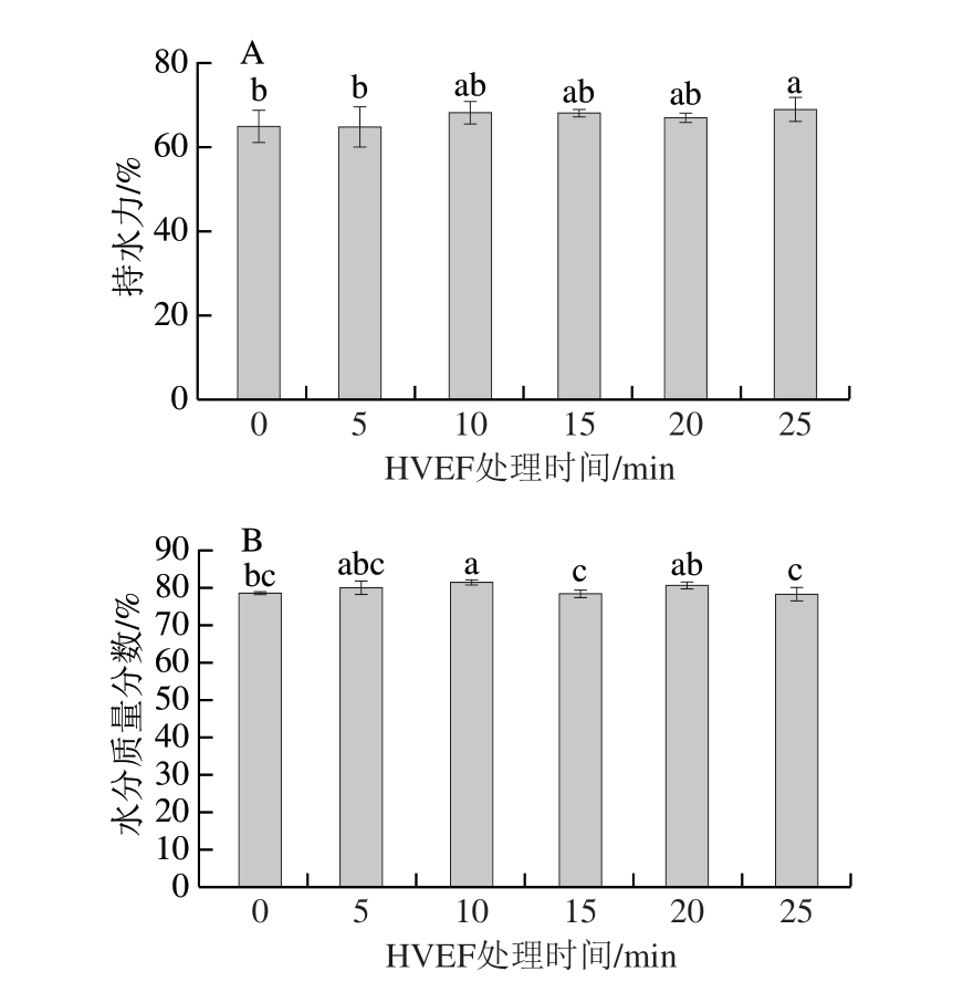 图8 不同HVEF处理时间对鮰鱼片持水力(A)和水分含量(B)的影响