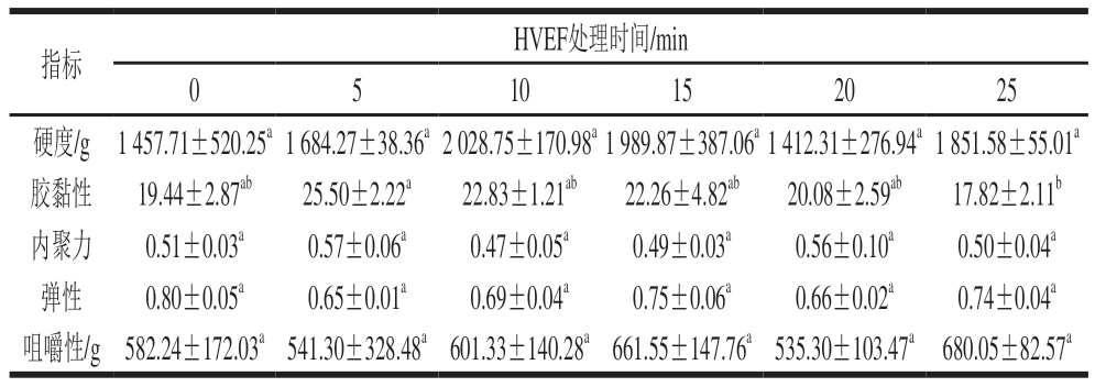 表1 不同HVEF处理时间对鮰鱼片质构特性的影响
