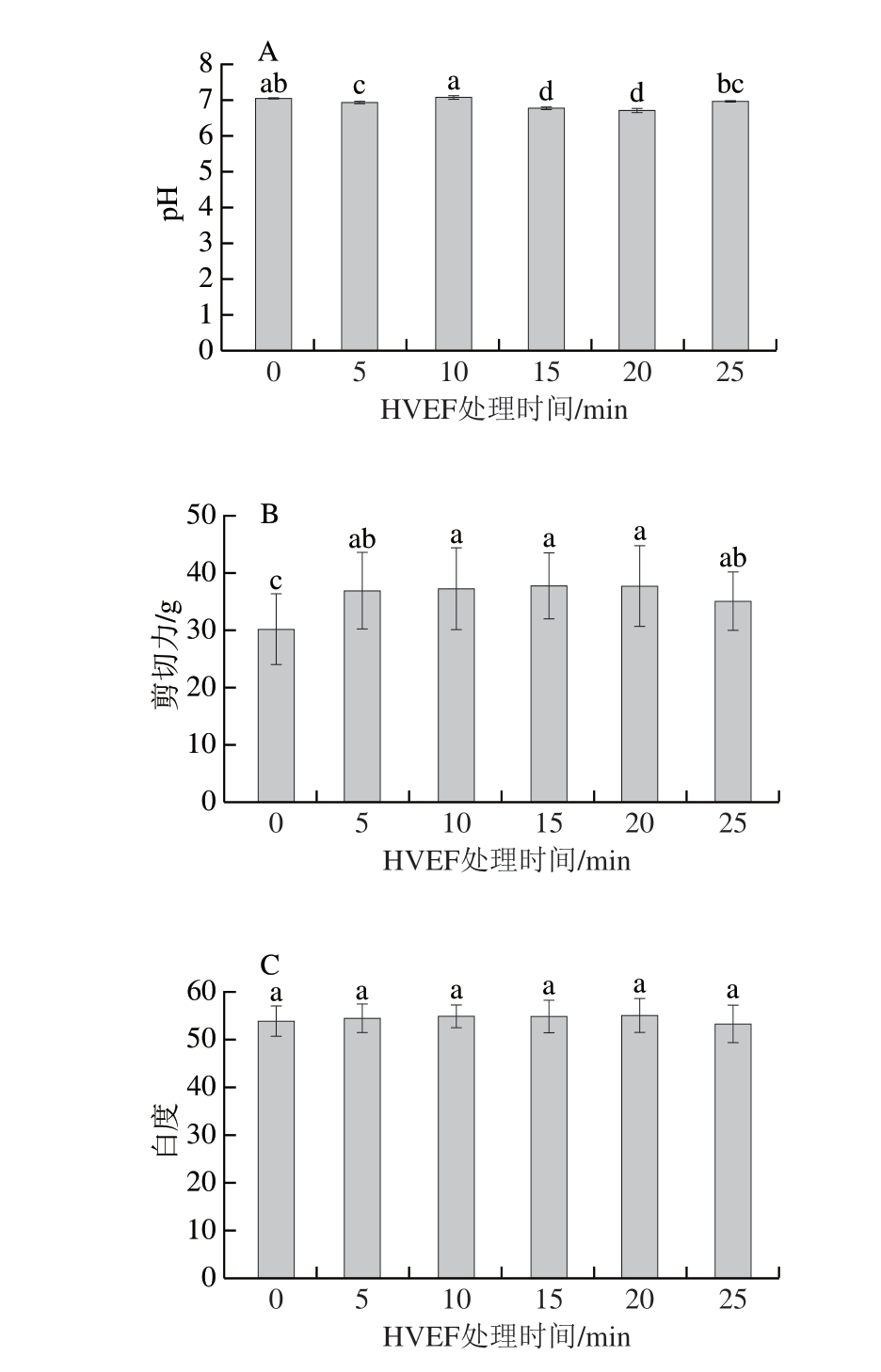 Fig. 7 Effects of different HVEF treatment times on pH (A), shear force (B), and whiteness (C) of channel catfish fillets